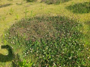 ちぎれやすいタンポポに、芝生に絡まるように繁茂したカタバミ、